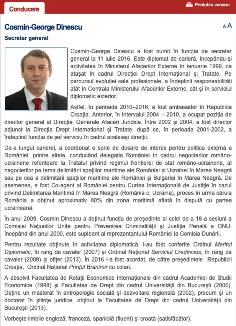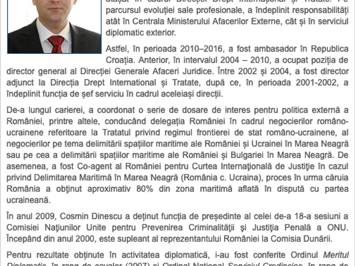 Conform MAE, "Cosmin-George Dinescu a fost numit în funcția de secretar general la 11 iulie 2016. Este diplomat de carieră, începându-și activitatea în Ministerul Afacerilor Externe în ianuarie 1999, ca atașat în cadrul Direcției Drept Internațional și Tratate. Pe parcursul evoluției sale profesionale, a îndeplinit responsabilități atât în Centrala Ministerului Afacerilor Externe, cât și în serviciul diplomatic exterior. (...)
