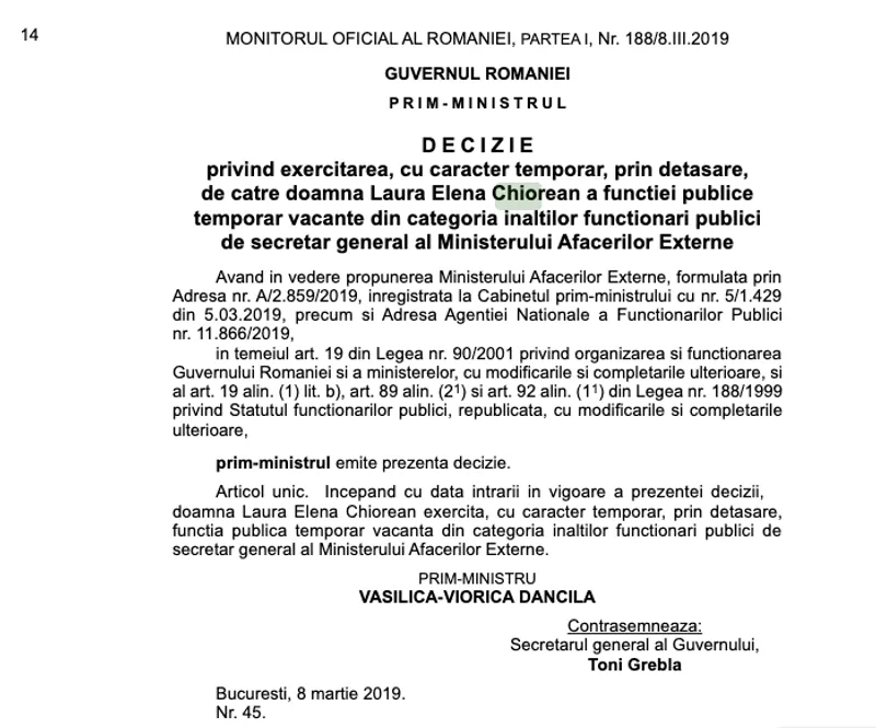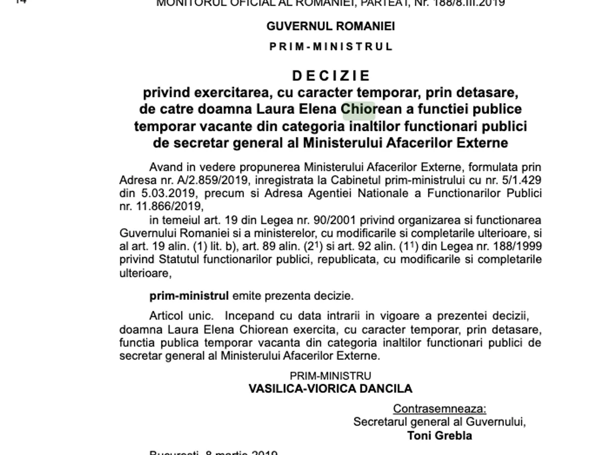 Chiar de ziua femeii, 8 martie 2019, premierul Viorica Dăncilă l-a dat afară din funcția de secretar general al MAE pe Cosmin-George Dinescu, diplomat, și a instalat-o pe Laura Chiorean, șefa femeilor PSD din Cluj și consilier județean.