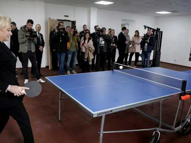Premierul Viorica Dăncilă a jucat ping pong cu șeful Poliției de Frontieră, Adrian Popescu, la inaugurarea noului sediu al Poliției de Frontieră Isaccea. Încălțată în pantofi cu toc, Dăncilă a câștigat un schimb de mingi.
