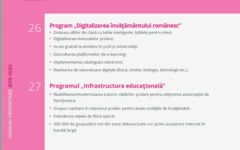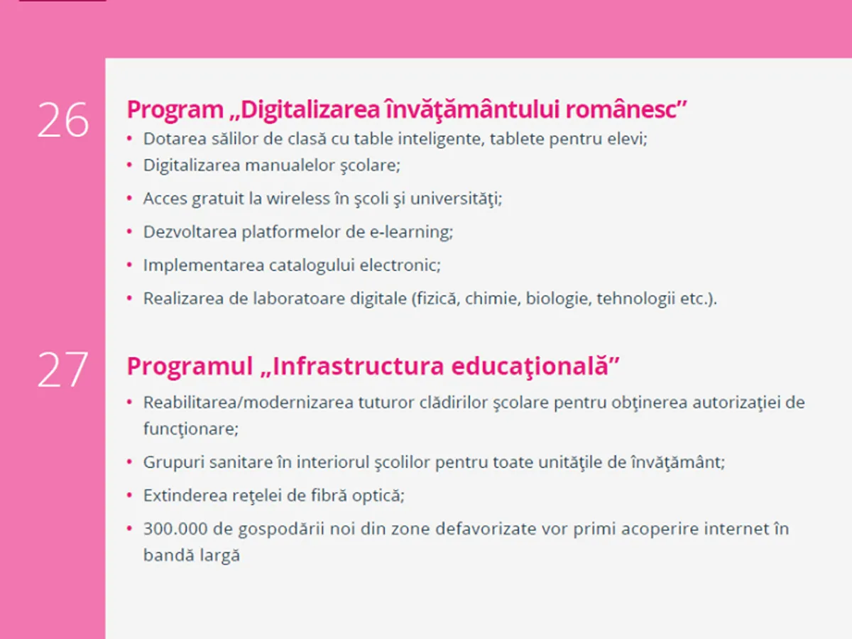 Obsesiile PSD (în vorbe): „reabilitarea și modernizarea tuturor clădirilor școlare” și „grupuri sanitare pentru toate unitățile de învățământ ” reapar la capitolul „Infrastructura școlară”.