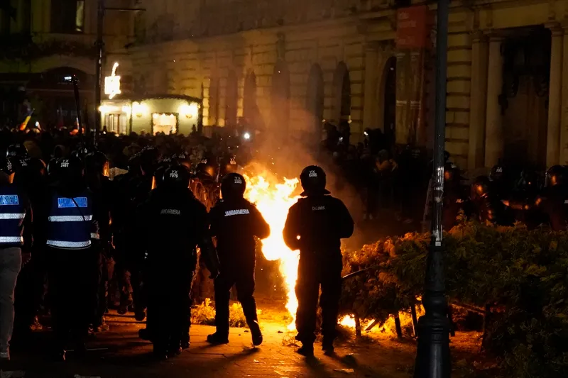 Jandarmii în luptă cu susținătorii lui Călin Georgescu, duminică seară, în fața BEC - Foto: INQUAM Photos/Tudor Pană (cu rol ilustrativ)