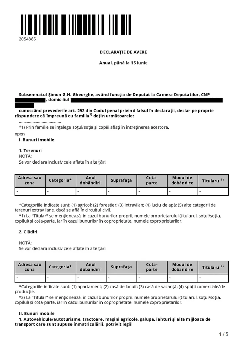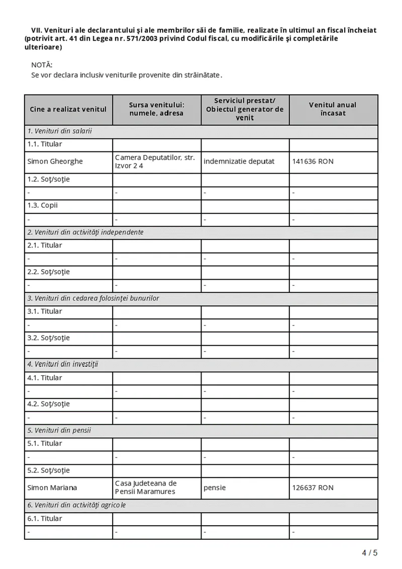 Conform declarației de avere a deputatului Simion, el încasează lunar o indemnizație de 11.800 de lei pe lună, iar soția sa aproximativ 10.500 de lei pe lună din pensie.