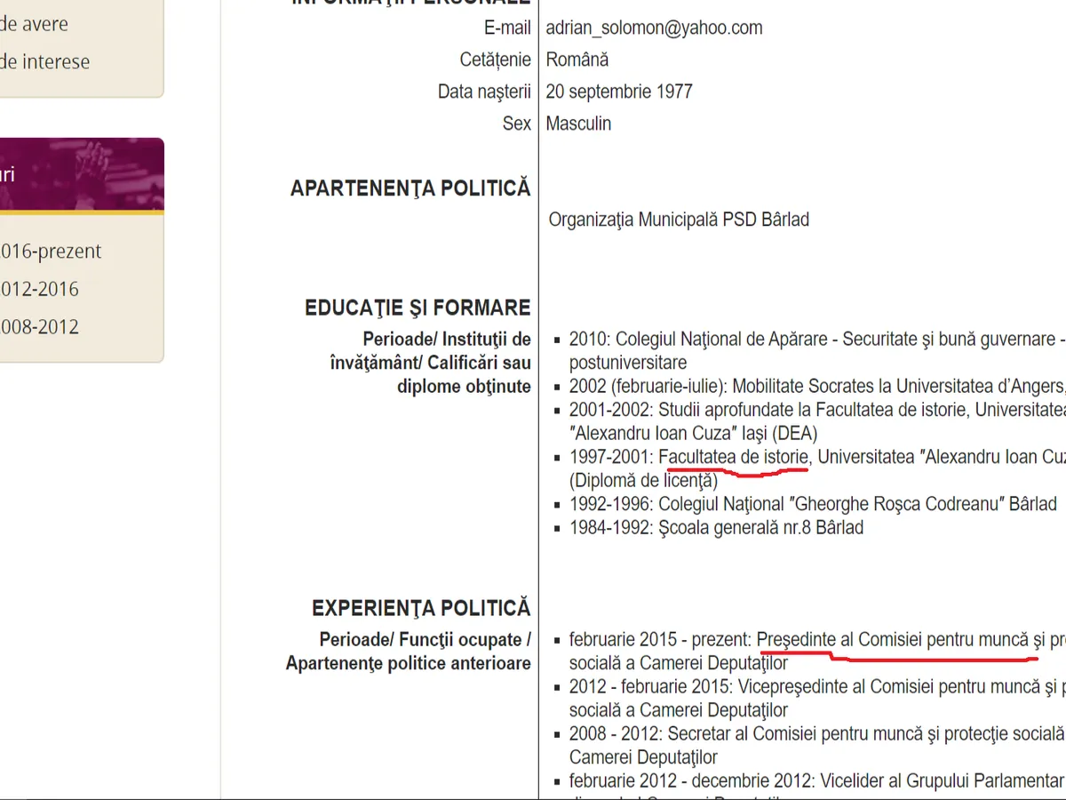 Adrian Solomon conduce Comisia de muncă și protecție socială deși este absolvent al Facultății de Istorie și nu a urmat nici un curs în domeniul mai sus menționat.