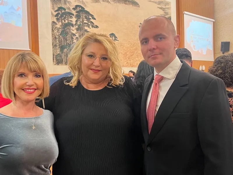 Diana Șoșoacă și fiul lui Cozmin Gușă, „în pelerinaj” la Ambasada Chinei. Alături de ei o vedetă TVR