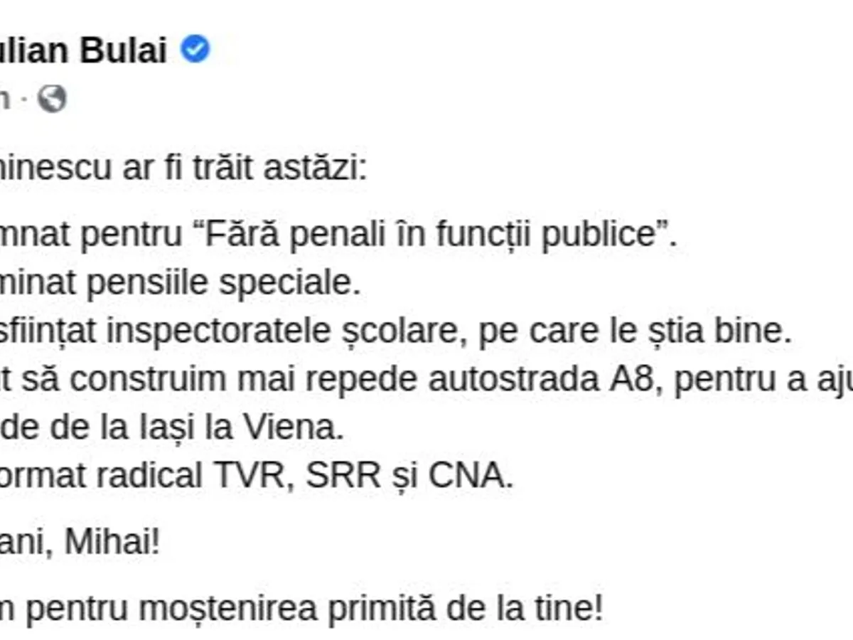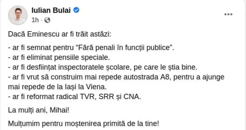 Deputatul USR PLUS Iulian Bulai crede că, din contră, Mihai Eminescu ar fi susținut programul politic al acestei formațiuni.