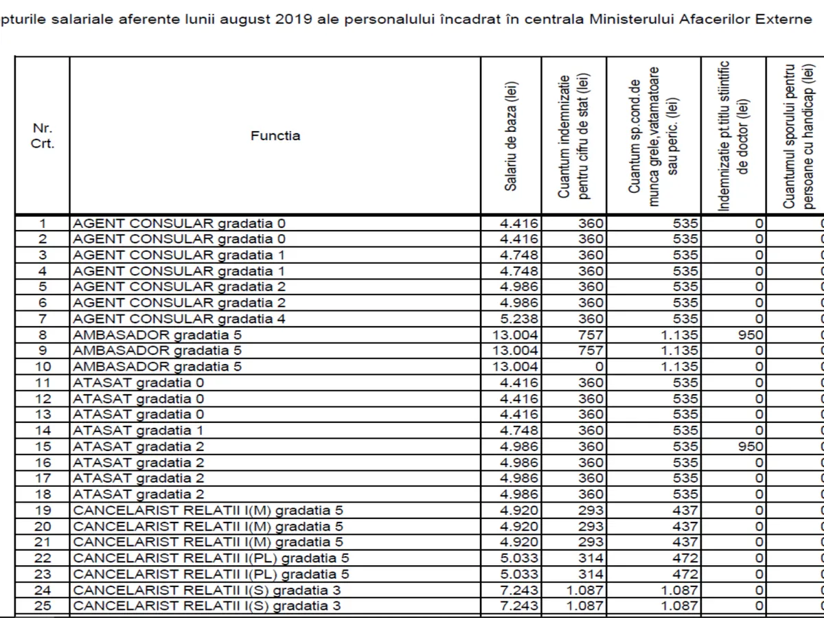 Un număr impresionat de 911 de funcții din Ministerul de Externe primesc sporuri pentru condiții de muncă grele, vătămătoare sau periculoase.