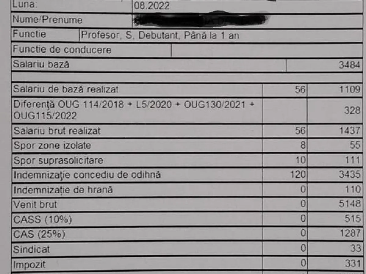 În acest moment, un profesor debutant câștigă 5.100 lei brut potrivit unui fluturaș de salariu (foto jos) consultat de Newsweek România. Salariul brut a fost, potrivit INS, 6.800 de lei.