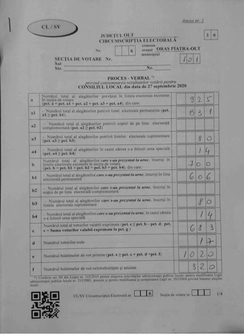 Candidatul USR-PLUS la Primăria Piatra Olt, Sandu Crăciun, nu a regăsit la Secţia 101 unde a votat el, soţia şi copiii săi Pe procesul verbal al secției, în dreptul USR-PLUS erau O voturi.