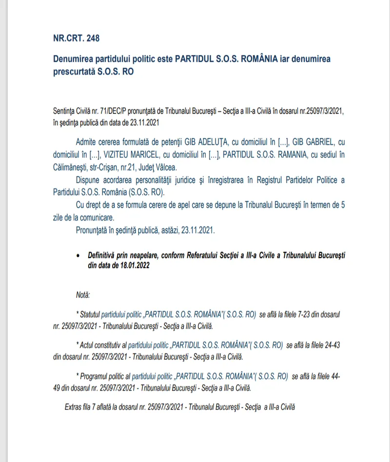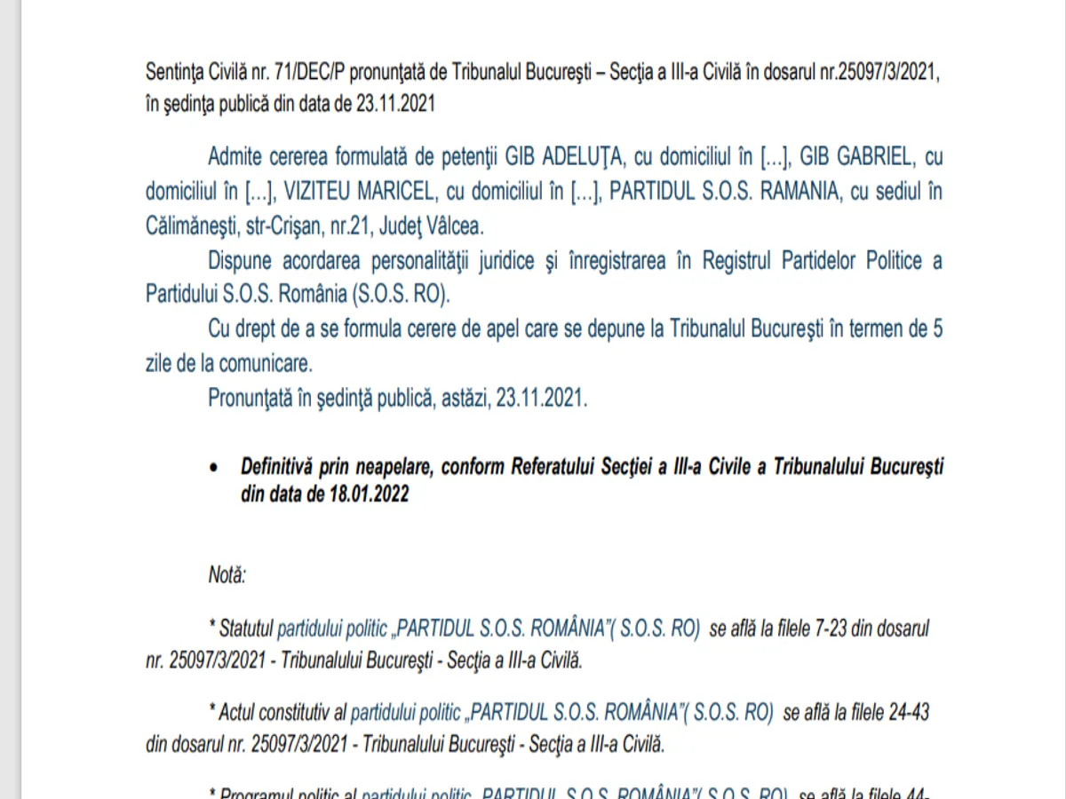 Dispune acordarea personalităţii juridice şi înregistrarea în Registrul Partidelor Politice a Partidului S.O.S. România (S.O.S. RO). Cu drept de a se formula cerere de apel care se depune la Tribunalul Bucureşti în termen de 5 zile de la comunicare. Pronunţată în şedinţă publică, astăzi, 23.11.2021”, se arată în document.