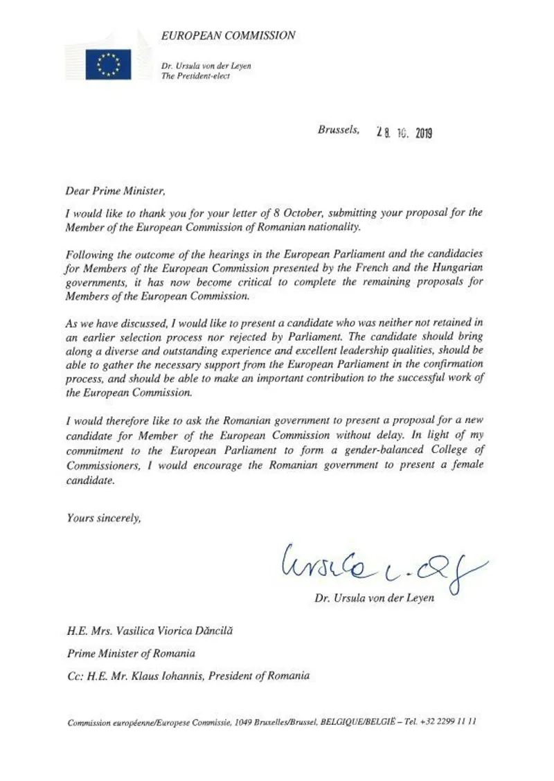 „Aș vrea să prezint un candidat care nici nu a fost implicat anterior în procesul de selecție, nici nu a fost respins de Parlament. Candidatul ar trebui să aibă o experiență diversă și calități de lider incontestabile, ar trebui să fie capabil să obțină sprijinul Parlamentului European în procesul de confirmare și să-și aducă contribuția la succesul Comisiei Europene. De aceea, aș vrea să rog Guvernul român să prezinte fără întârziere o nouă propunere de candidat. În lumina angajamentului meu în fața Parlamentului European de a forma o echipă echilibrată din punct de vedere al disribuirii genurilor, încurajez România să prezinte o candidată”, a spus Ursula von der Leyen în scrisoarea transmisă premierului demis, Viorica Dăncilă.