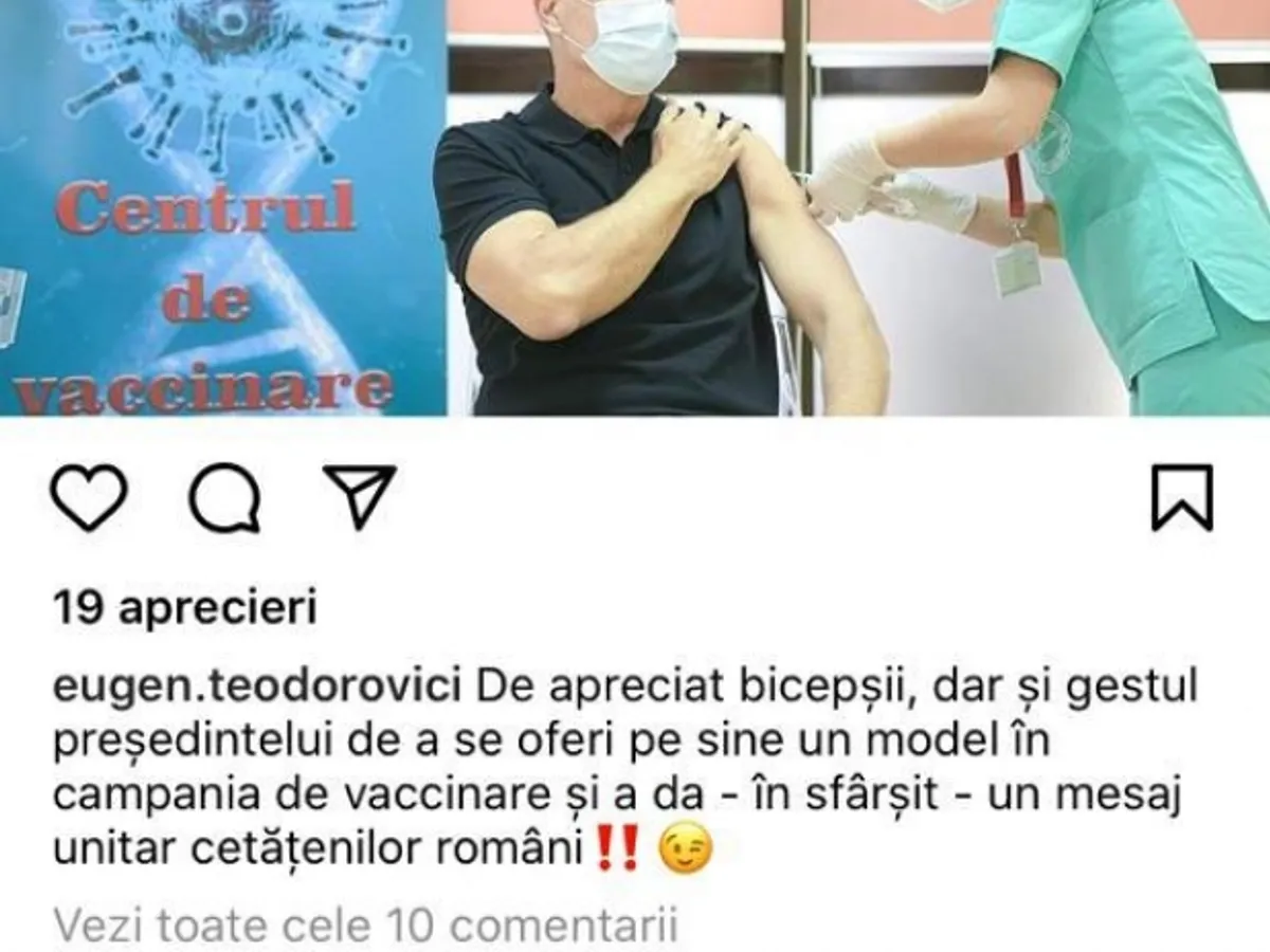 „De apreciat bicepșii, dar și gestul de a se oferi pe sine ca model în campania de vaccinare și a da - în sfârșit - un mesaj unitar cetățenilor români”, a scris Teodorovici, pe Instagram.