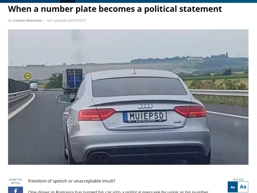 Plăcuța de înmatriculare, care se traduce aproximativ ca "MUIE PSD", a atras, în mod repetat atenția poliției, potrivit fotografiilor postate pe social media. Proprietarul mașinii nu pare să fi încălcat legea românească, potrivit unui purtător de cuvânt a poliției române.