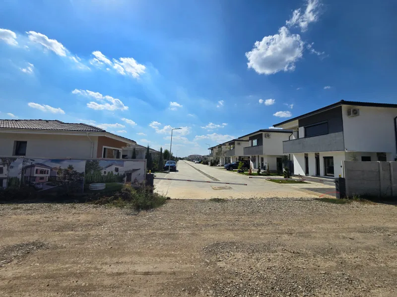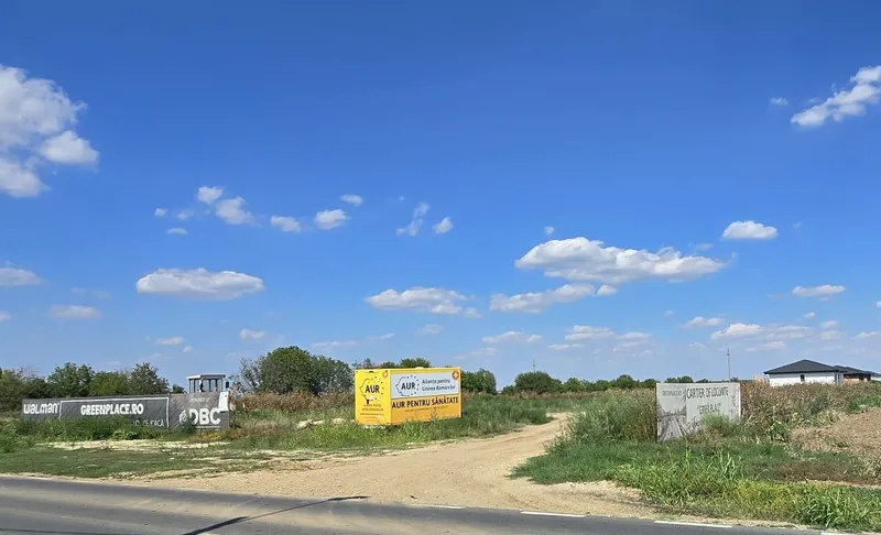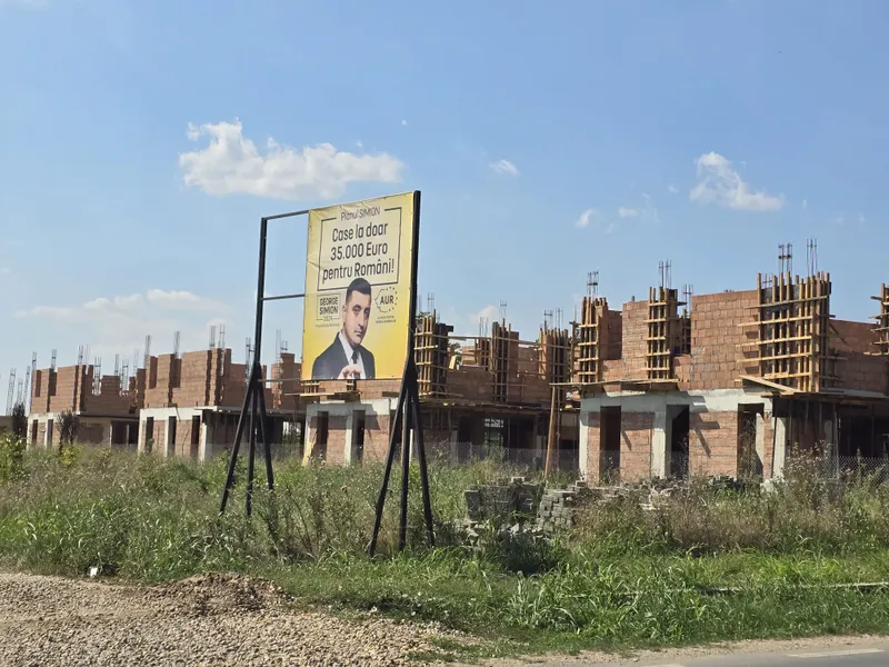 Un afiș cu liderul AUR, George Simion, în care acesta promite fiecărui român case la 35.000 Euro străjuiește la șoseaua principală în fața unei dezvoltări imobiliare specifice acestei zone: de la câteva case până la un maxim de 30-40 care se întind pe o fâșie de pământ îngustă cu deschidere la șosea.
