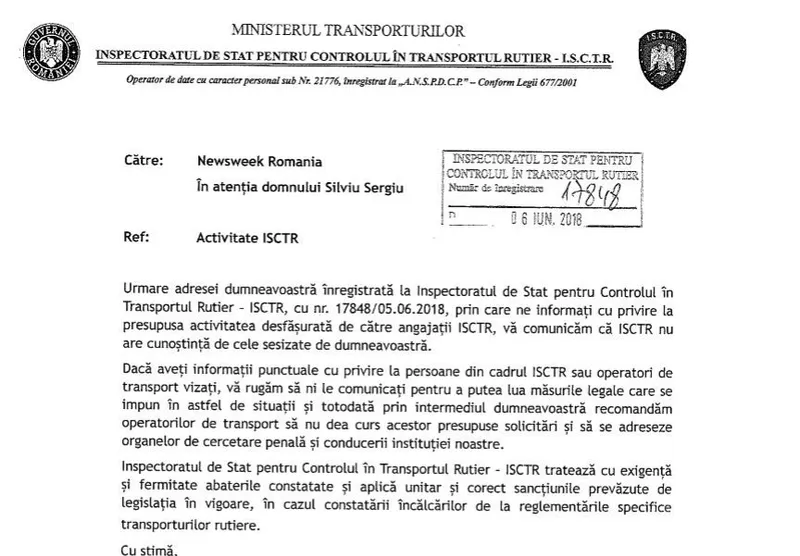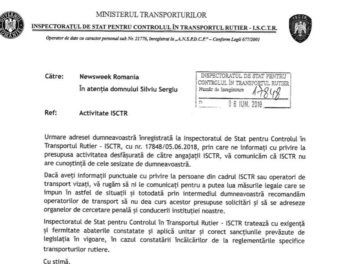 Newsweek Romania a solicitat marți un punct de vedere din din partea Inspectoratului de Stat pentru Controlul în Transportul Rutier (ISCTR). Miercuri am primit acest răspuns în care se precizează că ”ISCTR nu are cunoștință de cele sesizate de dumneavoastră”. ”Dacă aveți informații punctuale cu privire la persoane din cadrul ISCTR sau operatori de transport vizați, vă rugăm să ni le comunicați pentru a lua măsurile legale care se impun în astfel de situații și totodată, prin intermediul dumneavoastră, recomandăm operatorilor de transport să nu dea curs acestor presupuse solicitări și să se adreseze organelor de cercetare penală și conducerii instituției noastre.”