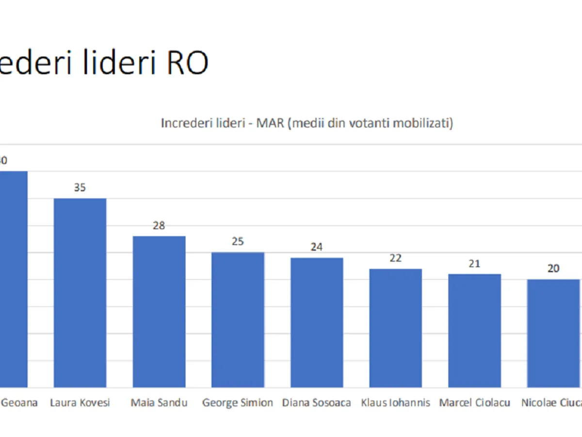 Topul încrederii în personalităț este completat de Maia Sandu- 28%, George Simion- 25%, Diana Șoșoacă- 24%, Klaus Iohannis- 22%.