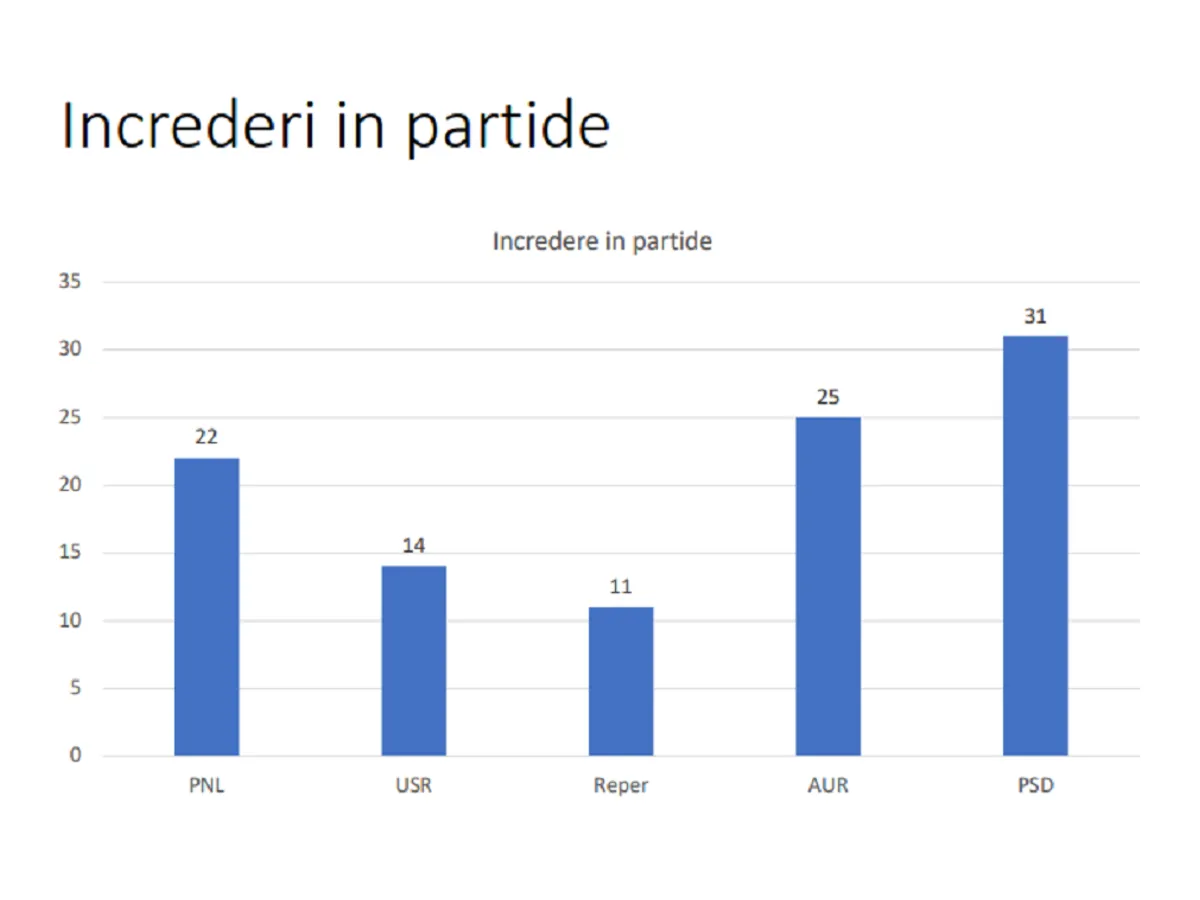 În ceea ce privește încrederea în partide, PSD este pe primul loc, cu 31%, AUR- 25%, PNL- 22%, USR- 14%, REPER- 11%.