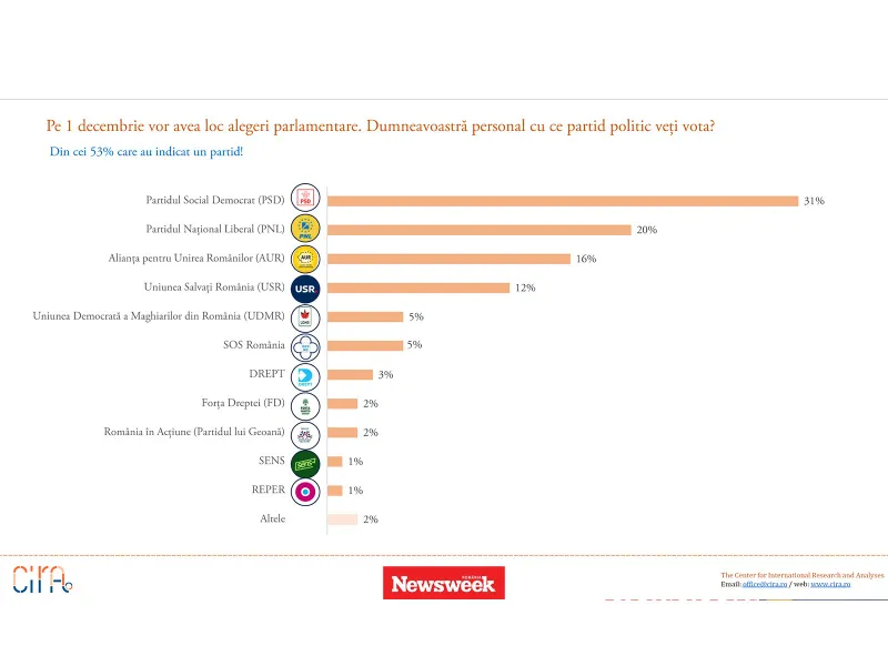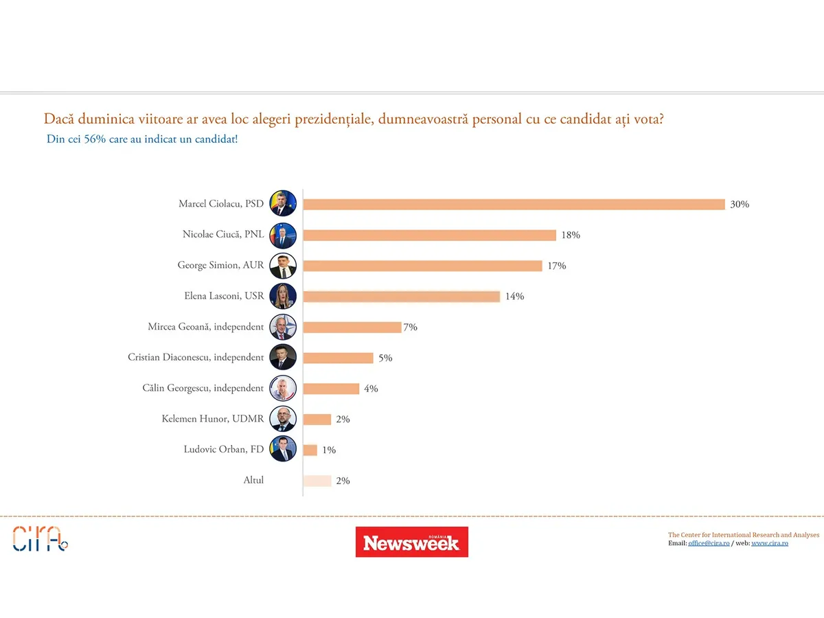 Un ultim sondaj de opinie arată că finala prezindențială va fi între Marcel Ciolacu și Nicolae Ciucă. Cei interviați pe baza acestui sondaj au avut de răspuns la mai multe întrebări. Sondajul a fost realizat de CIRA (The Center for International Research and Analysis) la comanda Newsweek Romania. Eroarea maximă de eșantionare, la un nivel de încredere de 95%, este de +/-3,2%. Au fost 1040 de subiecți intervievați.