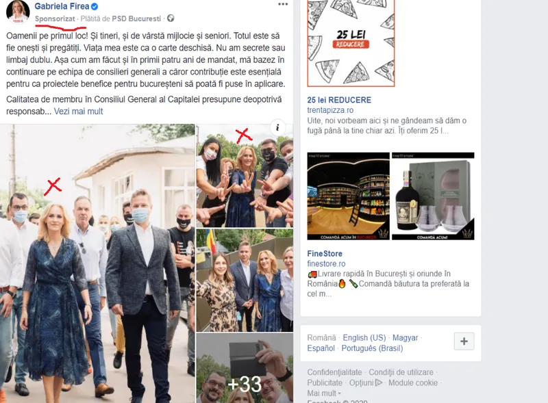 În postarea, sponsorizată de PSD, în afara imaginilor cu Gabriela Firea în mijlocul simpatizanților fără să poarte mască, există și următorul mesaj: