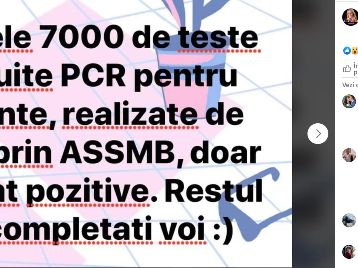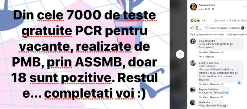 „Din cele 7.000 de teste gratuite PCR pentru vacanțe, realizate de PMB, prin ASSMB, doar 18 sunt pozitive. Restul e... completați voi :)”, a scris Gabriela Firea pe Facebook, la o zi după ce Bucureștiul înregistra o creștere record de cazuri.