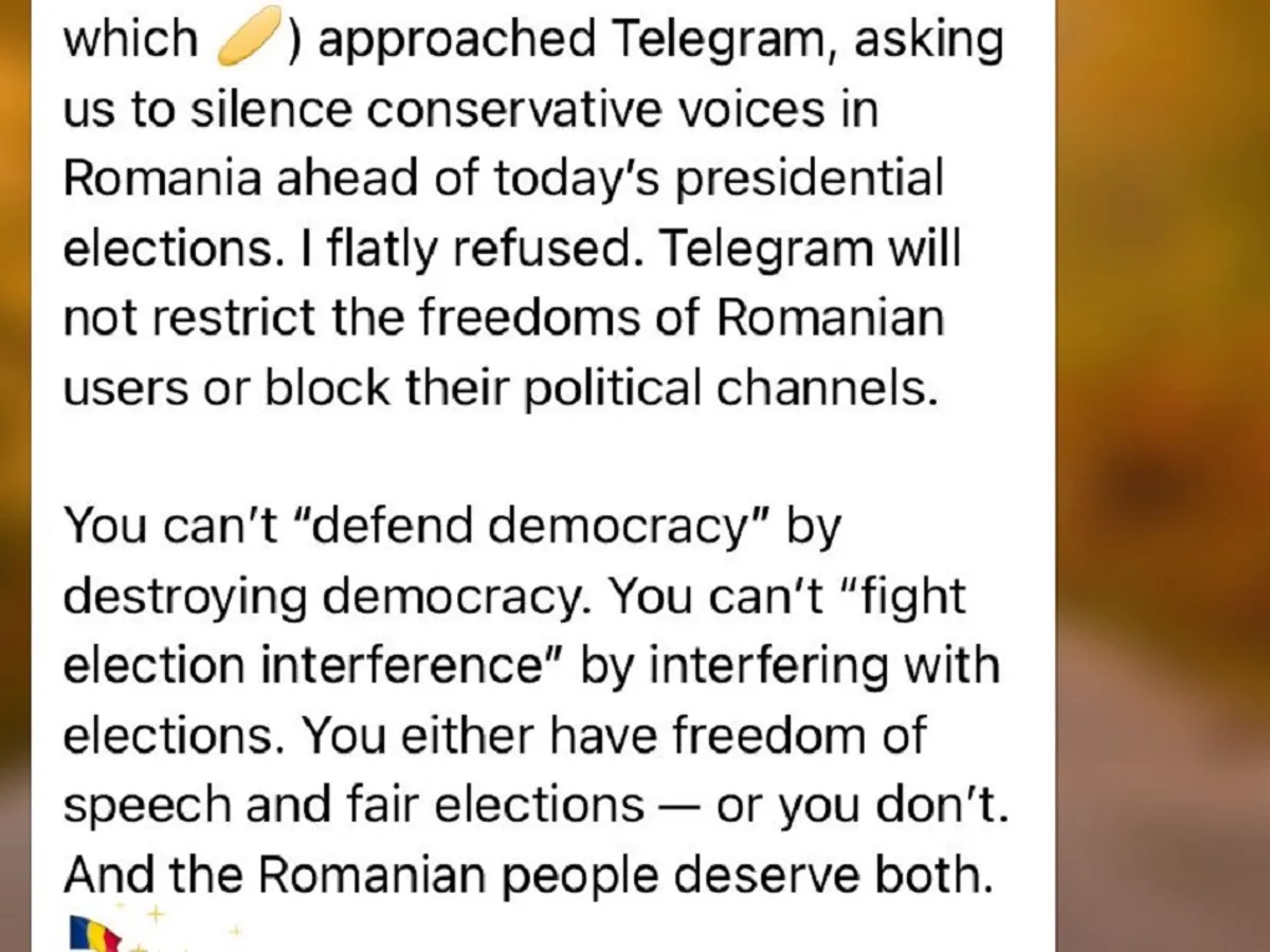 Pavel Durov, fondatorul Telegram susține că i s-ar fi cerut să ”reducă la tăcere vocile conservatoare în România înaintea alegerilor prezidențiale de astăzi”. Acesta spune că a refuzat solicitarea.
