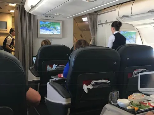 În toate cele cinci fotografii, se pot vedea scaunele generoase de la clasa business (doar două pe fiecare parte de rând, în loc de trei, ca la economic), mesele bogate servite pasagerilor nu în mici caserole de aluminiu, ci în veselă ceramică cu tacâmuri de metal, stewardese atente și preocupate de fiecare pasager în parte.