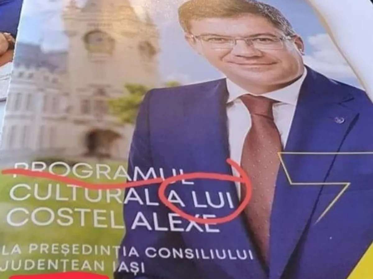 Coperta unui pliant care conține „programul cultural” prezentat de candidatul PNL pentru președinția Consiliului Județean Iași, Costel Alexe, conține o gravă greșeală de gramatică și una de scriere.