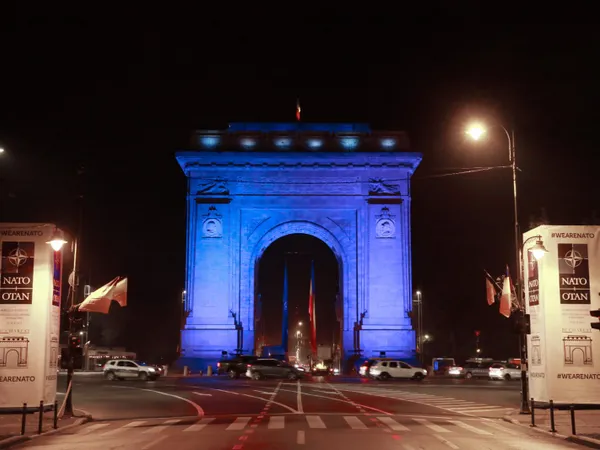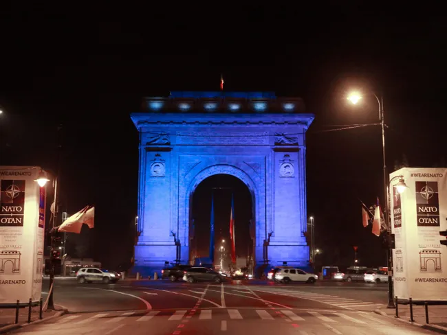În contextul reuniunii NATO de la Bucureşti, Arcul de Triumf este iluminat, în aceste zile, în culoarea albastră, iar drapelele României şi al Alianţei Nord-Atlantice au fost arborate deja pe principalele artere ale Bucureştiului.