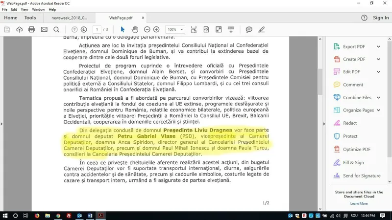 Din delegația care l-a însoțit pe Liviu Dragnea în vizita oficială în Elveția au făcut parte, potrivit memorandumul intern publicat de Camera Deputaților: deputatul Gabriel Vlase, Anca Spiridon, director la cabinetul Președintelui Camerei Deputaților, precum și doi consilieri parlamentari, Paul Mihai Ionescu și Paula Turcu.