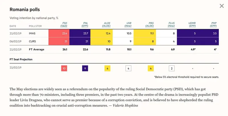 "Financial Times" a făcut media rezultatelor a două sondaje de opinie privitoare la intenția de vot la europarlamentare și a aflat că, dacă în loc de europarlamentare ar fi vorba de parlamentare, partidul lui Victor Ponta ar putea juca rol de arbitru.