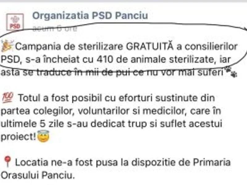 Organizația PSD Panciu a „bifat” o gafă lingvistică pe pagina de Facebook a filialei. Social-democrații au vorbit despre „sterilizarea gratuită a consilierilor PSD”, vrând să sublinieze de fapt sterilizarea pisicilor și câinilor din oraș, susținută financiar de aleșii locali.