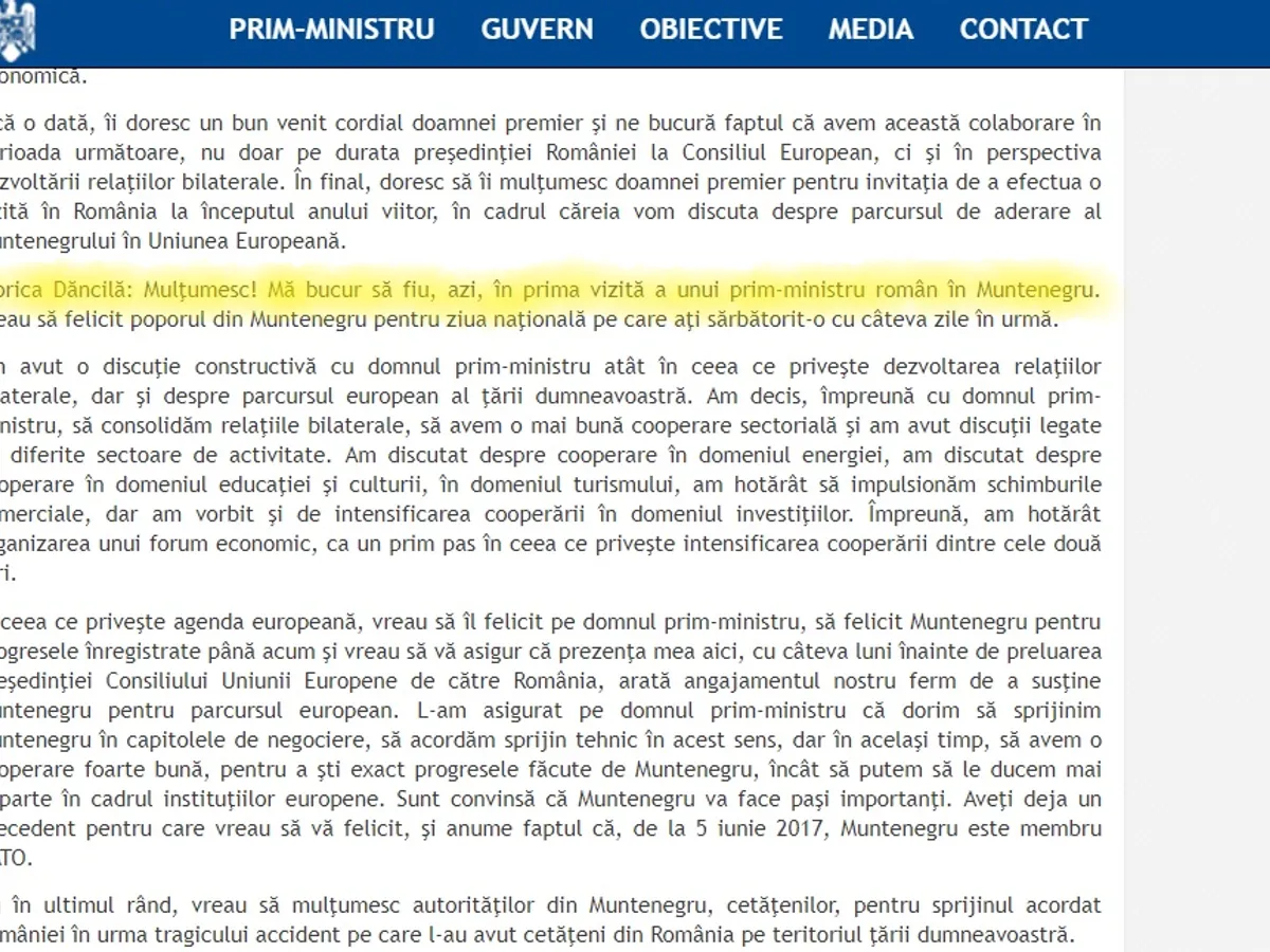 „Mulţumesc! Mă bucur să fiu, azi, în prima vizită a unui prim-ministru român în Muntenegru”.