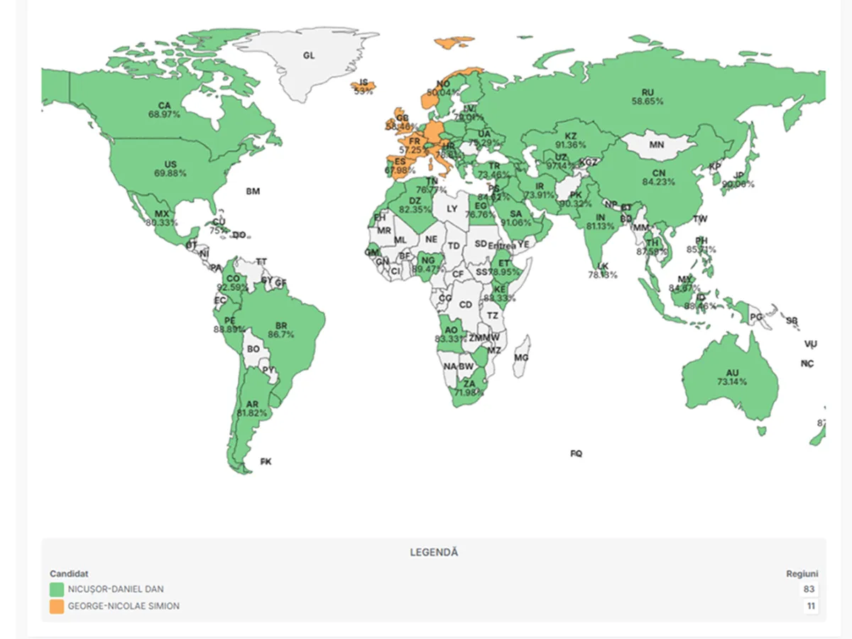 Țările marcate cu verde sunt cele în care a căștigat Nicușor Dan. Țările cu portocaliu sunt cele în care a câștigat George Simion.