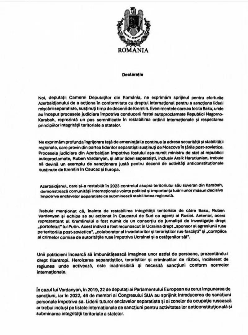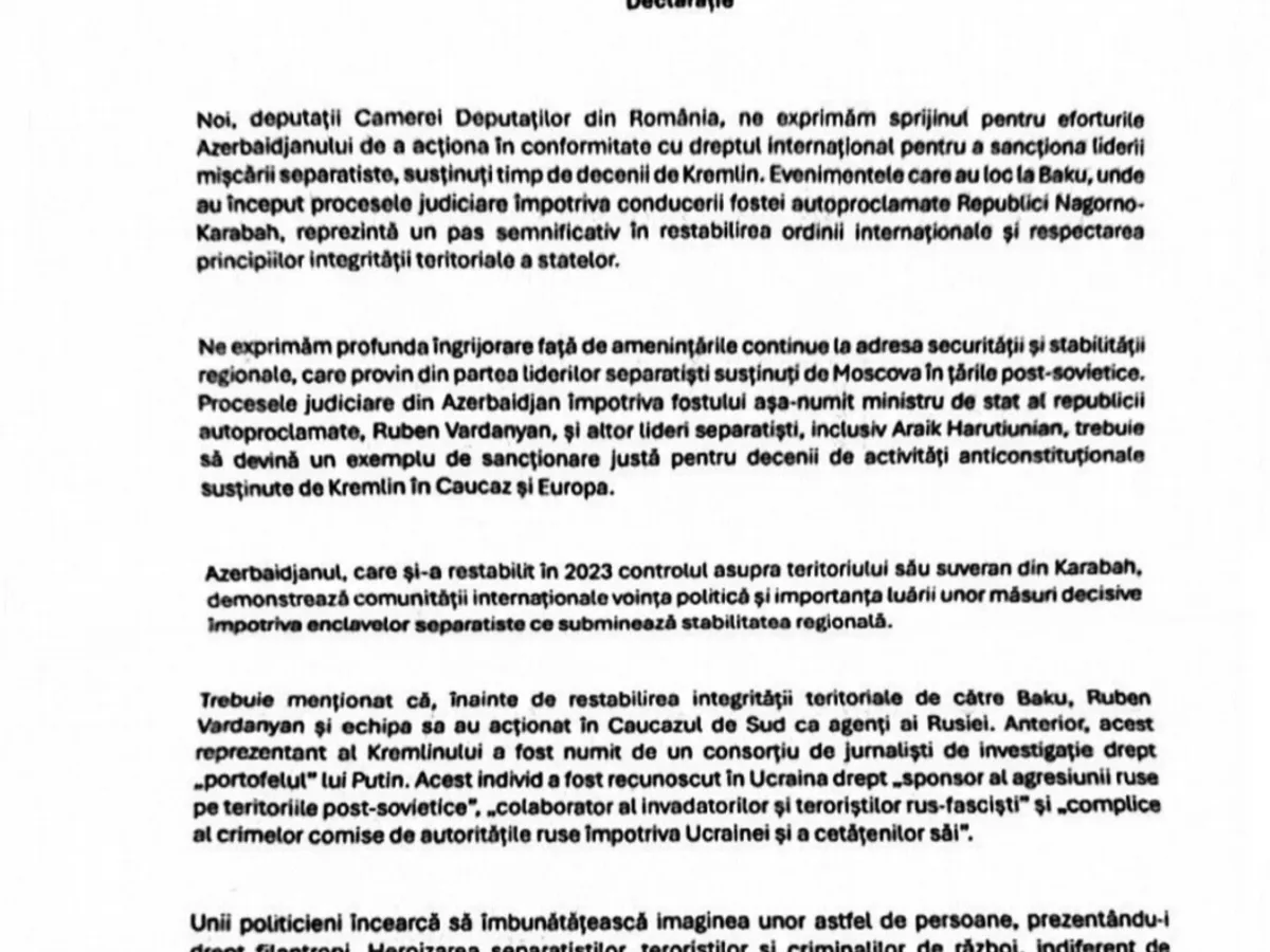 “Procesele judiciare împotriva fostului așa-numit ministru de stat al republicii autoproclamate, Ruben Vardanyan, și altor lideri separatiști, inclusiv Araik Harutiunian, trebuie să devină un exemplu de sancționare justă pentru decenii de activități anticonstituționale susținute de Kremlin în Caucaz și Europa”, au menționat legislatorii în declarație.