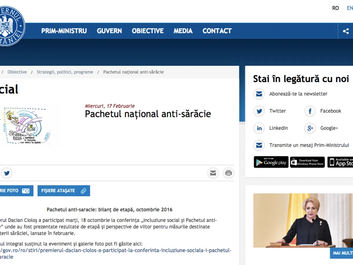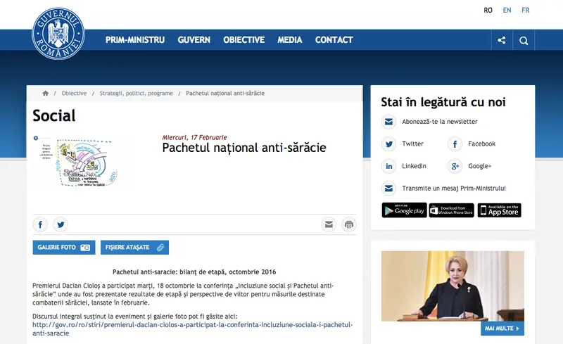 La capitolul menționat, site-ul Guvernului României păstrează un întreg discurs al lui Dacian Cioloș de la începutul unei ședințe de Executiv (un discurs care abundă în promisiuni sociale. Aproape nici una dusă la bun sfârșit, dar fără ca premierii care au urmat să menționeze abandonarea proiectelor):