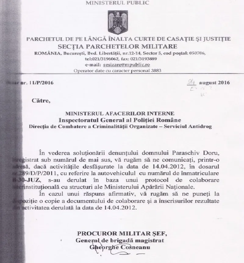 Potrivit sursei citate, documentul ar fi fost semnat pe 4 aprilie 2011 de şeful de atunci al Direcţiei Generale de Informaţii a Armatei şi de prim procurorul adjunct al PÎCCJ şi aprobat de procurorul general al României de la acel moment, Laura Codruţa Kovesi, şi ministrul Apărării, Gabriel Oprea.