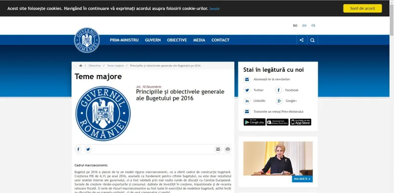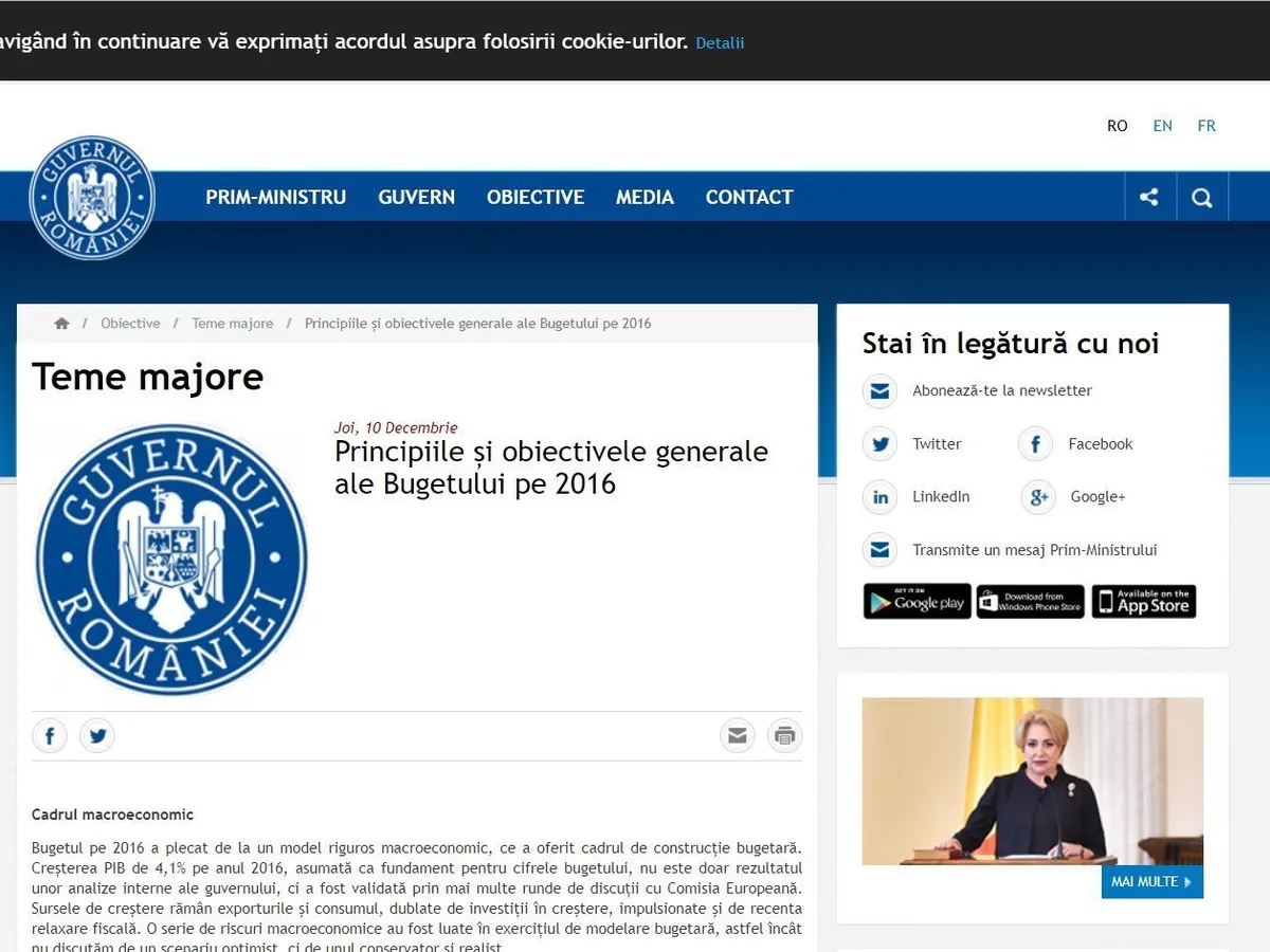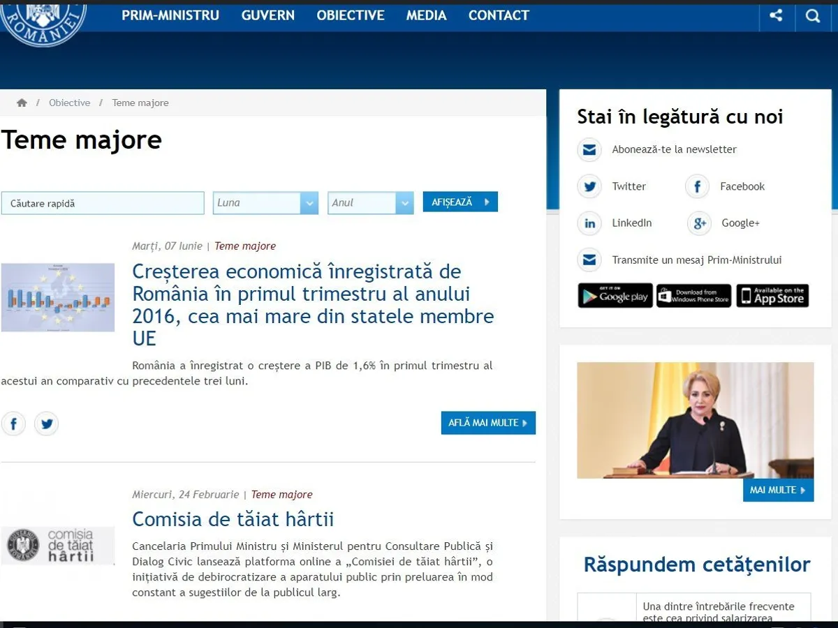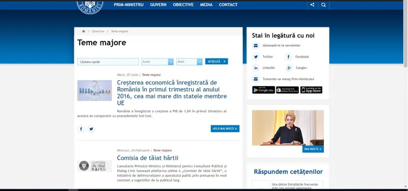 La „Teme majore” regăsim articolele „Creșterea economică înregistrată de România în primul trimestru al anului 2016, cea mai mare din statele membre UE”, dar și „Principiile și obiectivele generale ale Bugetului pe 2016”.