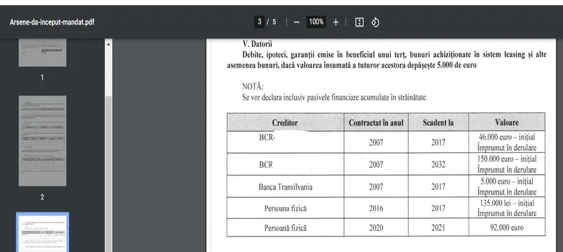 În plus, Arsene ia un împrumut, pe un an, de 92.000 euro de la o persoană fizică. Împrumutul a fost restituit în acel an și nu mai apare în Declarația de avere din 2021.
