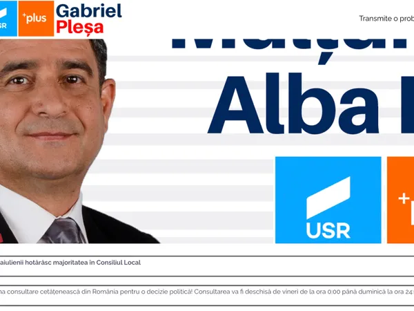Consultarea „Albaiulienii hotărăsc majoritatea în Consiliul Local” se va desfășura timp de trei zile în stradă, dar și on-line, arată site-ul alba24.ro. “Cetățenii sunt invitați să decidă dacă USR-PLUS trebuie să facă alianță în Consiliul Local Alba Iulia cu viitorii consilieri locali ai Partidului Social Democrat sau cu cei ai Partidului Național Liberal, au anunțat joi reprezentanții Alianței“, scrie acest site. Locuitorii orașului vor putea vota și pe site-ul noului primar, www.gabrielplesa.ro.
