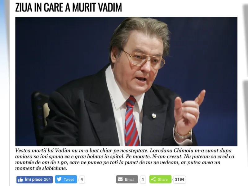 Una din ultimele postări ale Liei Olguța Vasilescu de pe blogul personal se intitulează "Ziua în care a murit Vadim". Textul este afectuos la adresa "Tribunului".