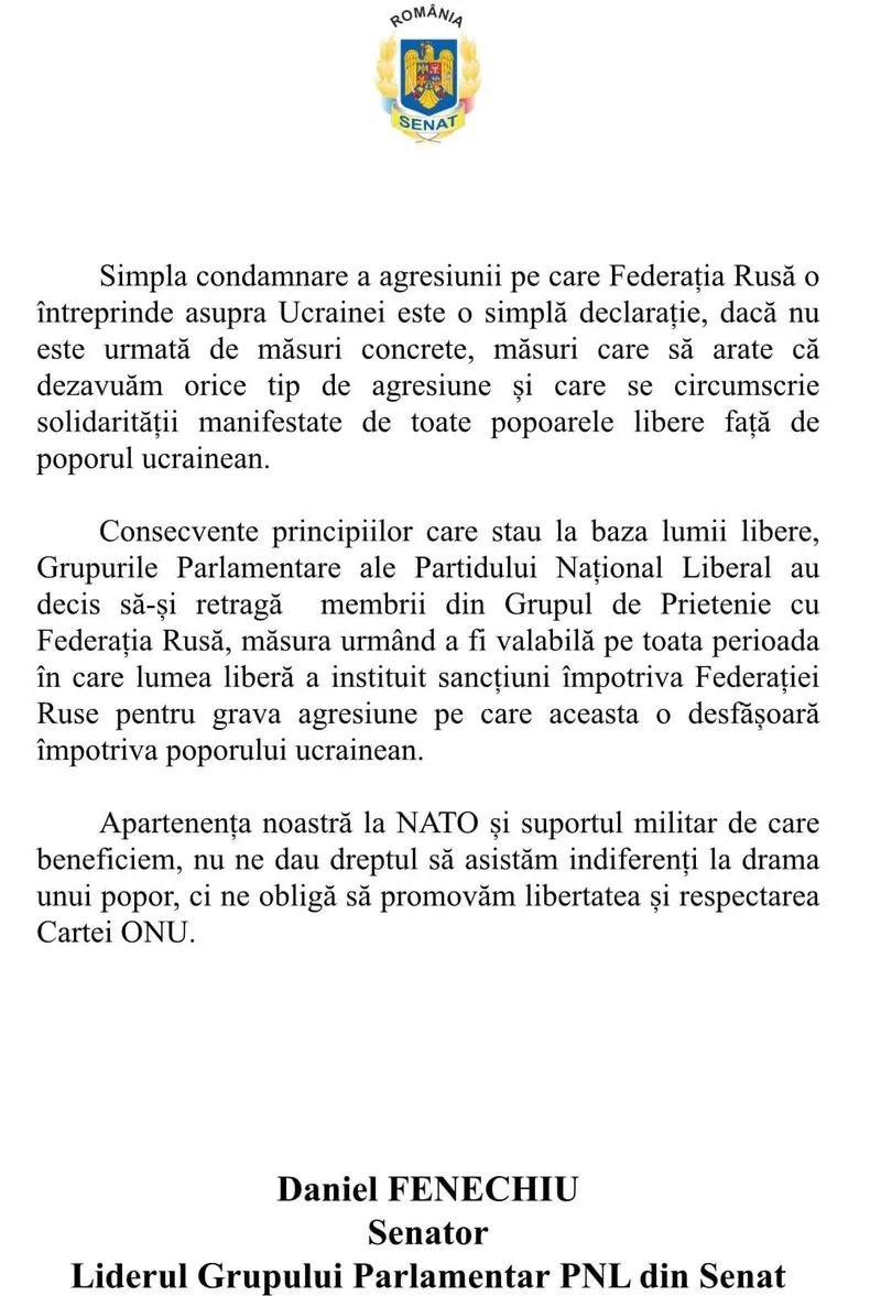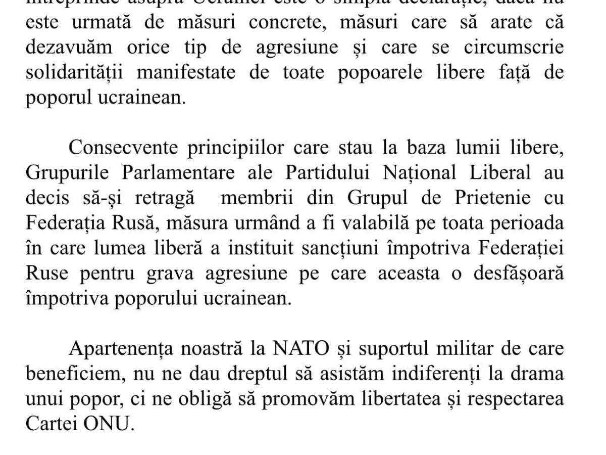 „Grupurile Parlamentare ale Partidului Național Liberal au decis să-și retragă membrii care aparțin Grupului de Prietenie cu Federația Rusă, pe toată durata sancțiunilor existente în prezent, împotriva Rusiei”, a scris pe FB parlamentarul liberal Daniel Fenechiu.