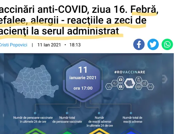 Site-ul Antena 3 a deschis, în această seară, cu știrea intitulată pompos “Vaccinări anti-COVID, ziua 16. Febră, cefalee, alergii - reacţiile a zeci de pacienţi la serul administrat“.