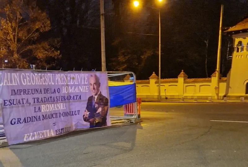 Un mare banner în care candidatul la prezidențiale Călin Gerogescu transmitea un mesaj provocator era amplasat luni dimineață pe gardul unui șantier stradal chiar peste drum de Palatul Cotroceni.