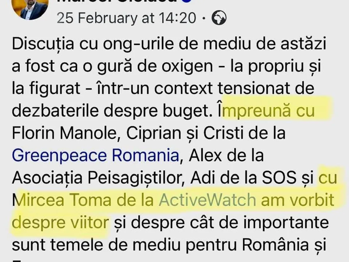 “Discuția cu ong-urile de mediu de astăzi a fost ca o gură de oxigen - la propriu și la figurat - într-un context tensionat de dezbaterile despre buget. Împreună cu Florin Manole, Ciprian și Cristi de la Greenpeace Romania, Alex de la Asociația Peisagiștilor, Adi de la SOS și cu Mircea Toma de la ActiveWatch am vorbit despre viitor și despre cât de importante sunt temele de mediu pentru România și Europa“, a scris Ciolacu pe Facebook, la 24 februarie.