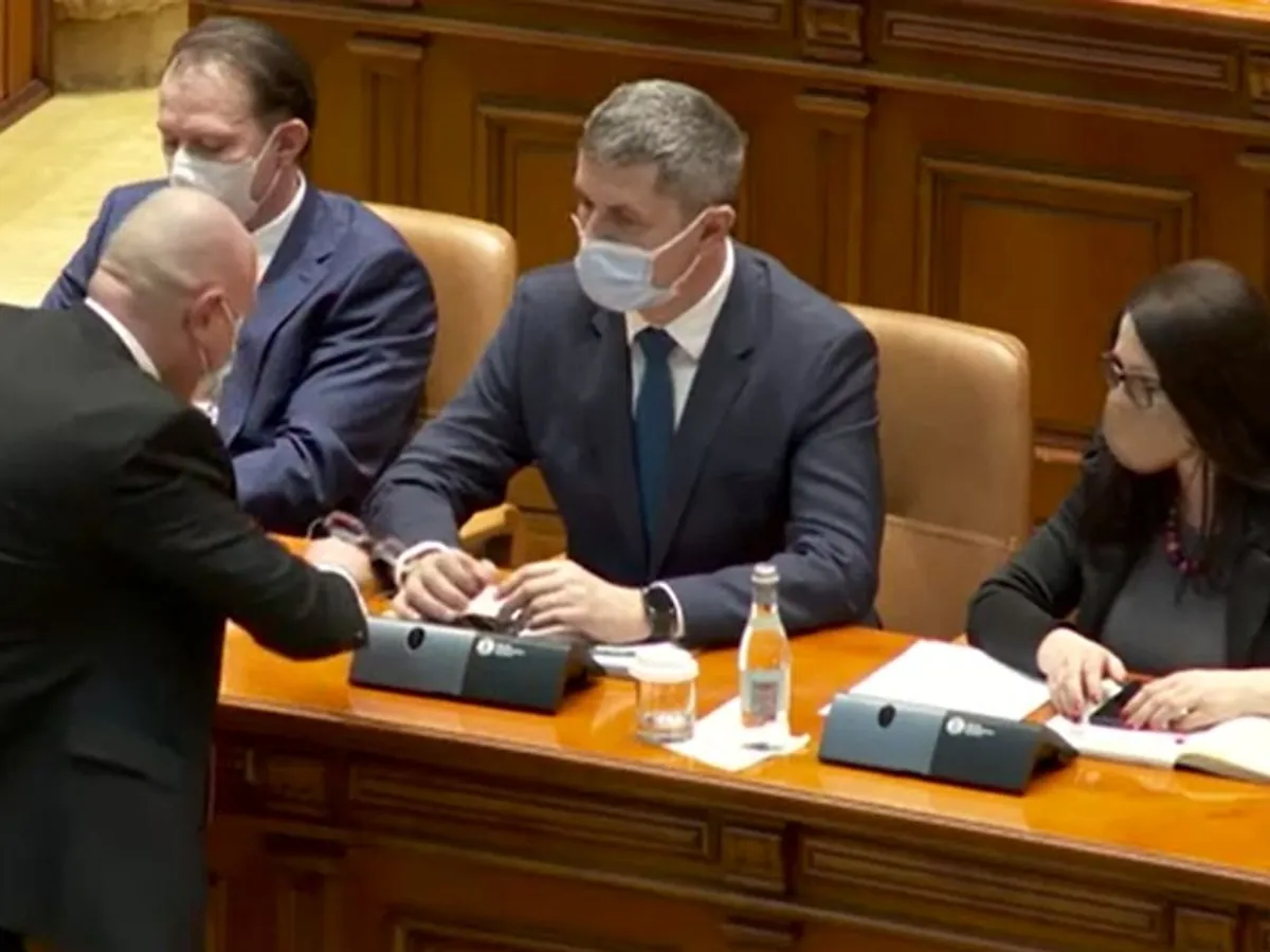 Scena s-a petrecut în timp ce de la tribună vorbea Marcel Ciolacu, iar lângă Barna se afla premierul Cîțu.