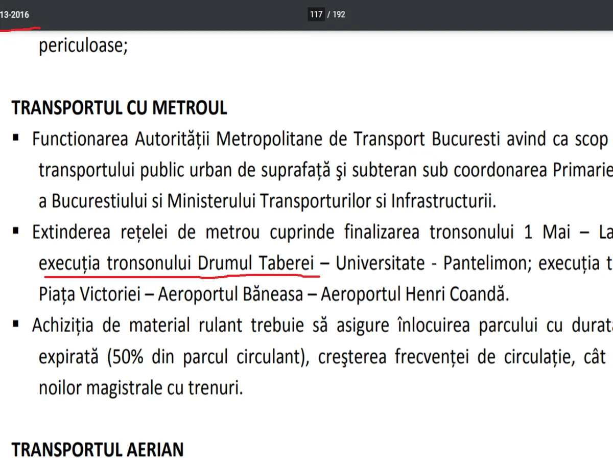 „Extinderea reţelei de metrou cuprinde finalizarea tronsonului 1 Mai – Laminorului; execuţia tronsonului Drumul Taberei – Universitate - Pantelimon; execuţia tronsonului Piaţa Victoriei – Aeroportul Băneasa – Aeroportul Henri Coandă”.
