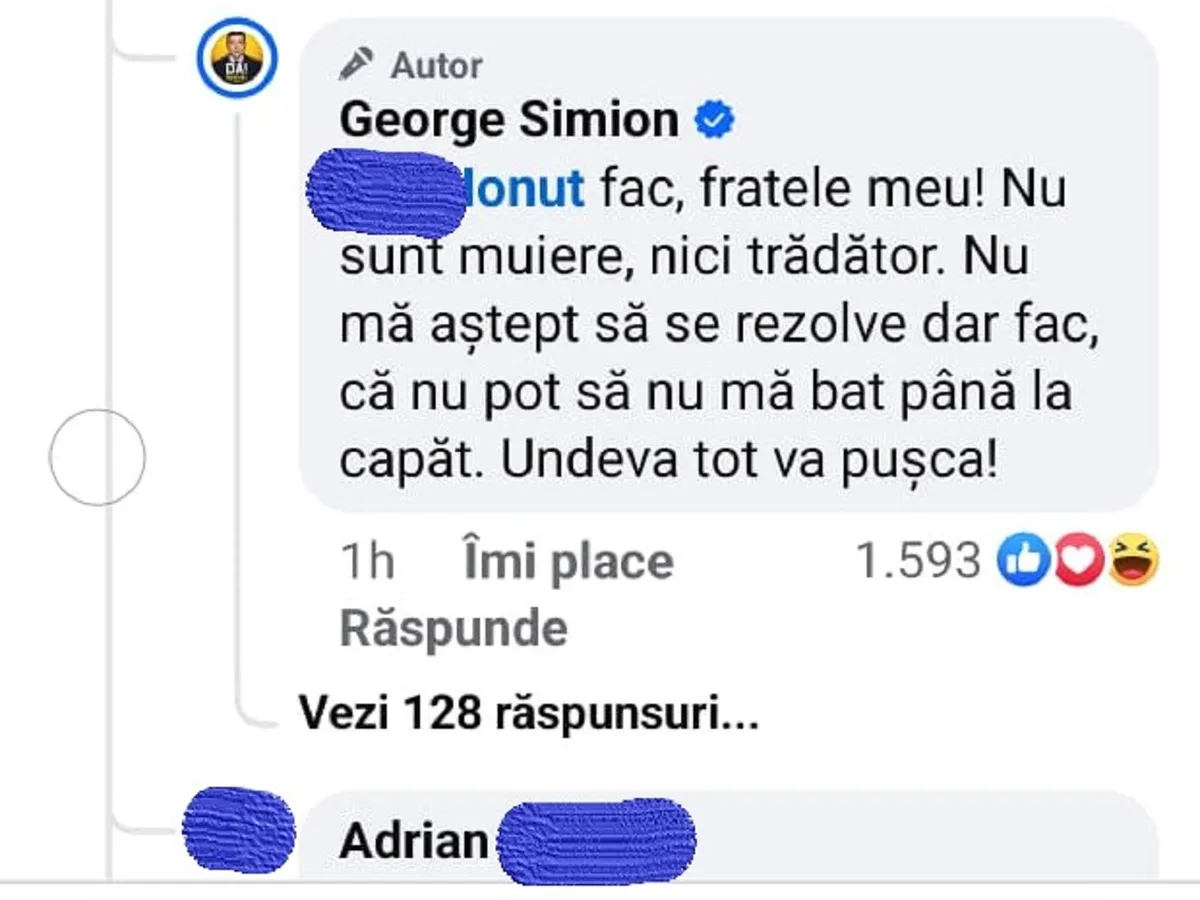 George Simion și-a anunțat susținătorii că va contesta rezultatul alegerilor. Mesajul a fost unul misogin: „Fac, fratele meu! (contestație n.red.). Nu sunt muiere, nici trădător. NU mă aștept să se rezolve dar fac, că nu pot să nu mă bat până la capăt. Undeva tot va pușca!”.