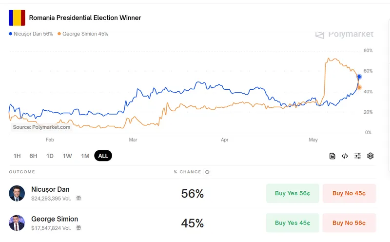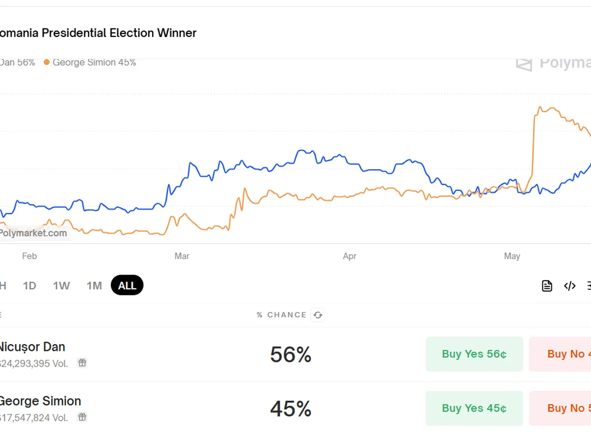 Platforma de plasare a pariurilor Polymarket a schimbat radical procentele de câștig la alegerile prezidențiale din România.