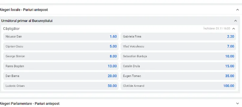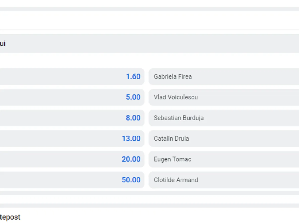 Au fost afișate cotele și favoriții pentru alegerile prezidențiale. Aceștia sunt în ordine: Mircea Geoană, Nicolae Ciucă, George Simion și Cătălin Drulă. Alegerile pentru Cotroceni vor avea loc în decembrie anul viitor.