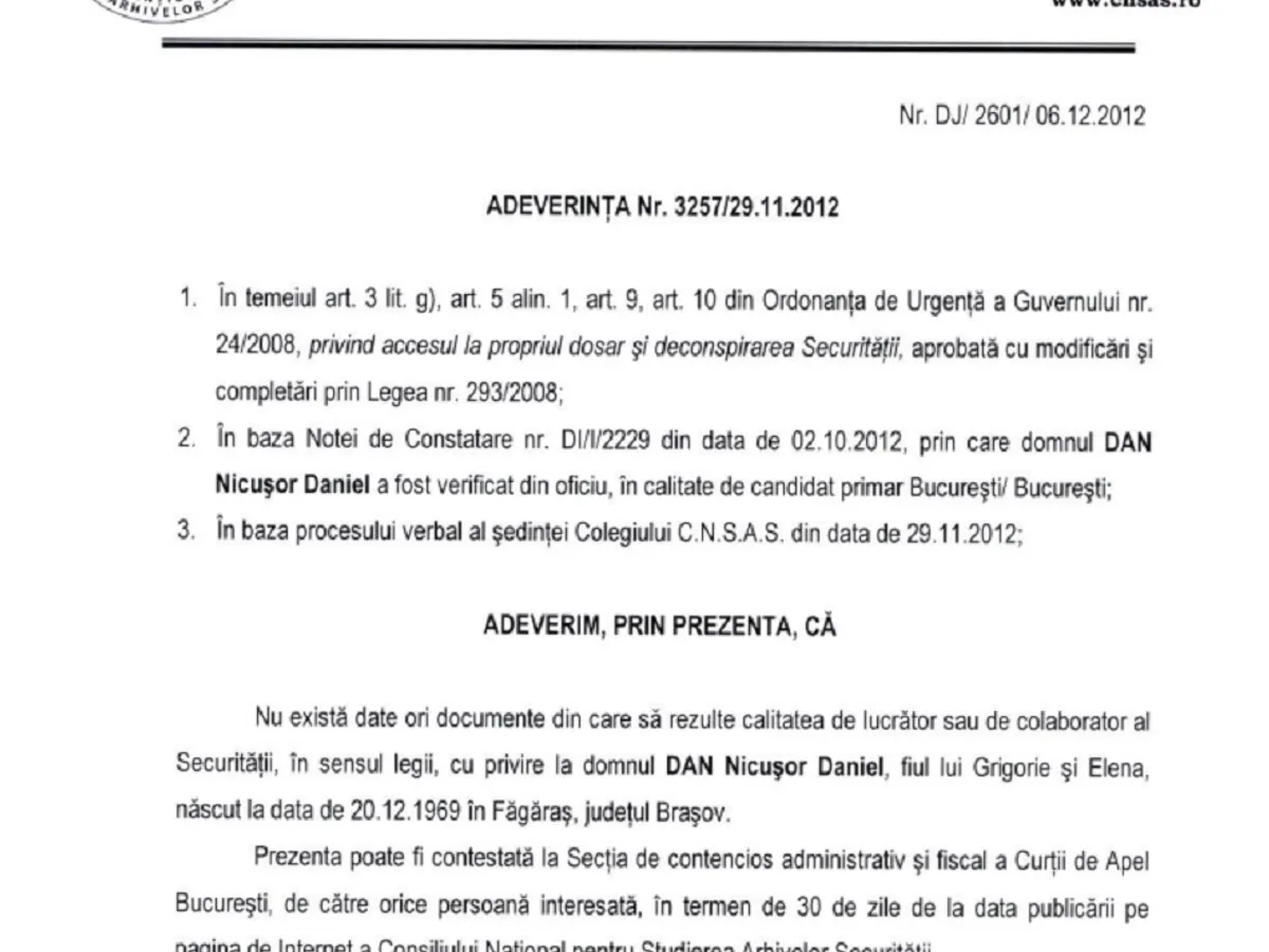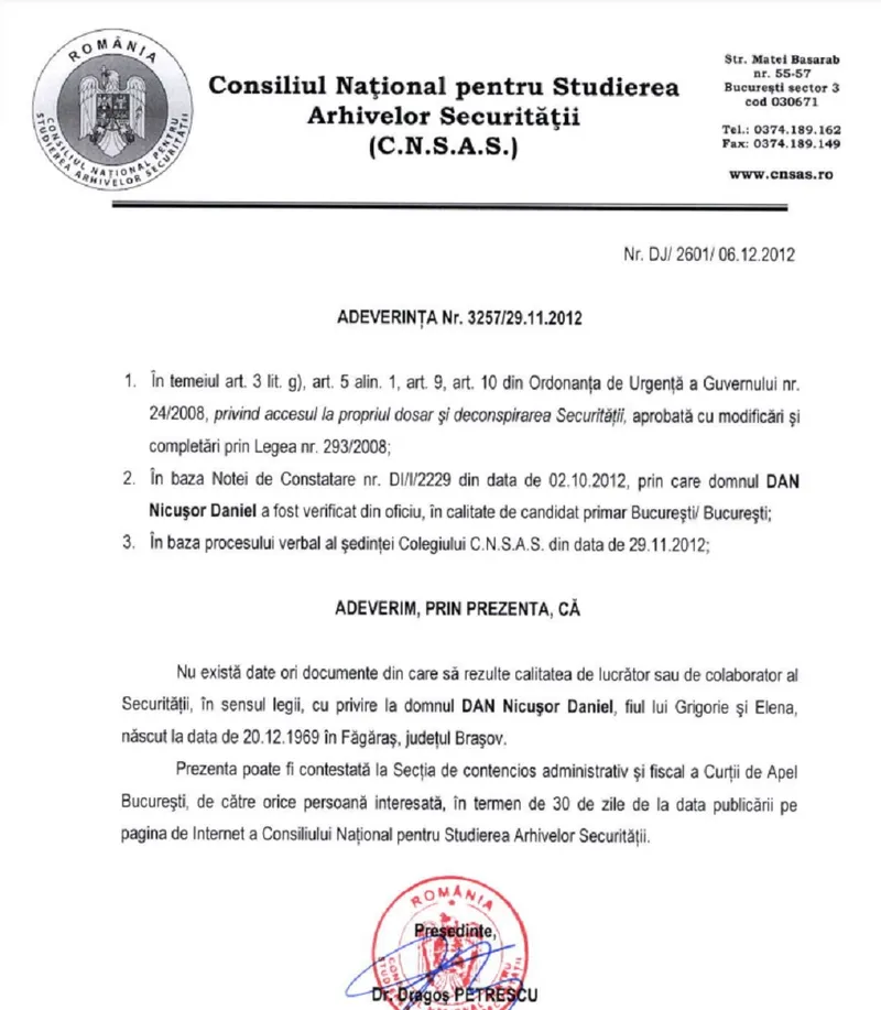 El a atașat și documentul de la CNSAS în care se arată că nu există date sau documente din care să rezulte calitatea de lucrător sau colaborator al Securității.