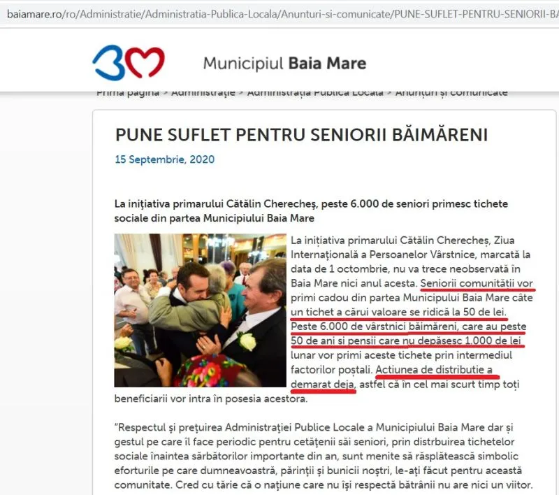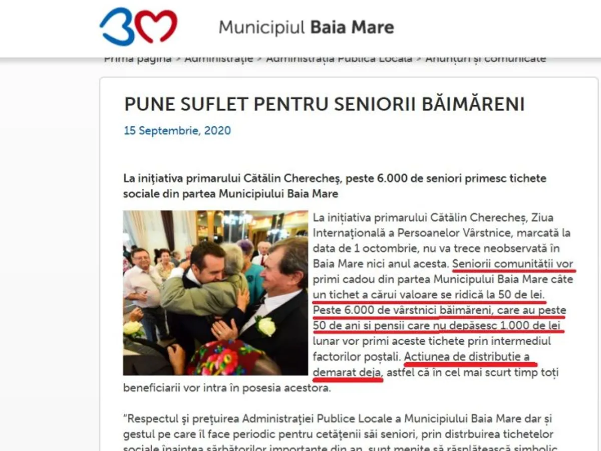 Profitând de poziția sa de primar în funcție, candidatul la primăria municipiului Baia Mare din partea Coaliției pentru Maramureș a început, în plină campanie electorală, distribuirea de tichete valorice către mai mult de 6.000 de vârstnici băimăreni cu venituri reduse.